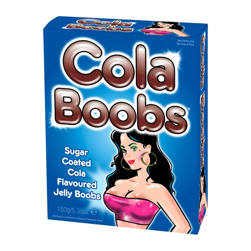 Ce pack comprend 150 grammes de bonbons en forme de seins « Cola Boobs », au goût cola et recouverts de sucre.